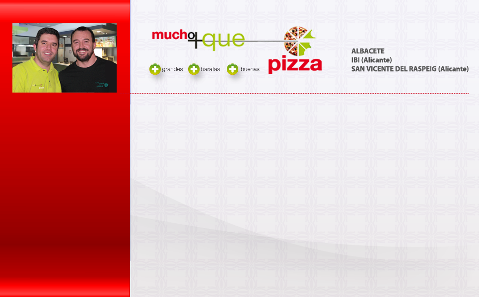 Vinculados desde el año 1994 al mundo de la pizza, y con amplia experiencia en el sector de la comida preparada, en 2010 crean su propia marca mucho+que pizza y empiezan a comercializar sus pizzas con la apertura de la tienda de Albacete, en la Plaza Mayor. También en ese año comienza a funcionar la tienda de Ibi(Alicante), ubicada en una plaza muy destacada de la localidad juguetera, la de los Reyes Magos. Recientemente, en Junio de 2012, una tercera tienda mucho+quepizza ha comenzado a funcionar de manera brillante en la localidad alicantina de San Vicente del Raspeig, muy cerca del Parque Lo Torrent y a escasos trescientos metros de las instalaciones de la Universidad de Alicante.